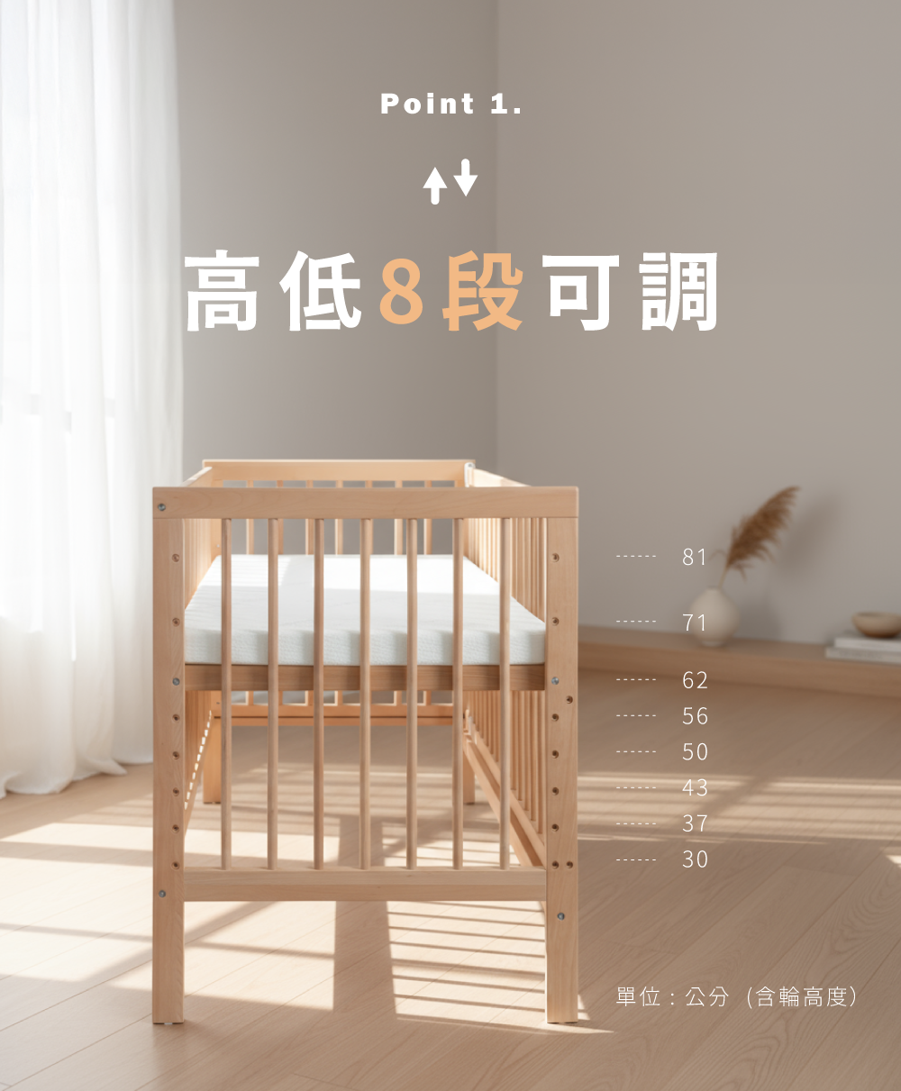 Crib25A-7M是Crib25A的升級款,於2025年7月份上市,床板高低可調:6段 -> 8段,結構部分改良。