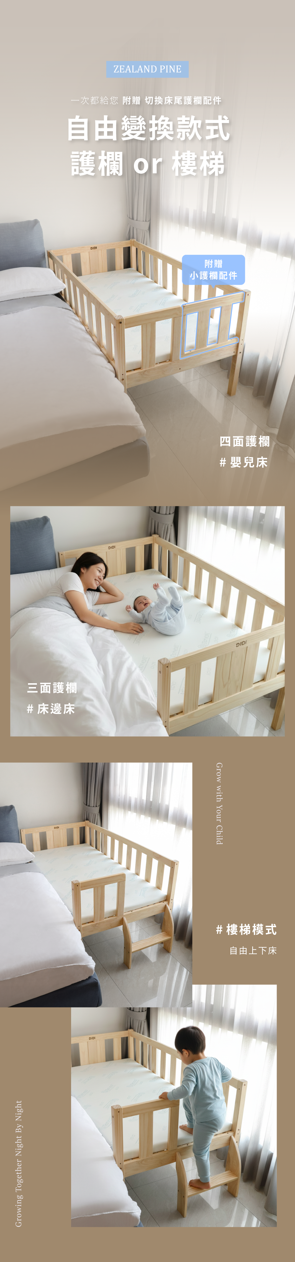 A3:可以,須加購配件小護欄變為四面護欄模式,小孩開始學習站立時須注意,通常年齡9個月到18個月的幼兒,護欄的高度是不足的,屆時父母需要在旁照看。預防攀爬,護欄高度至少要61公分。