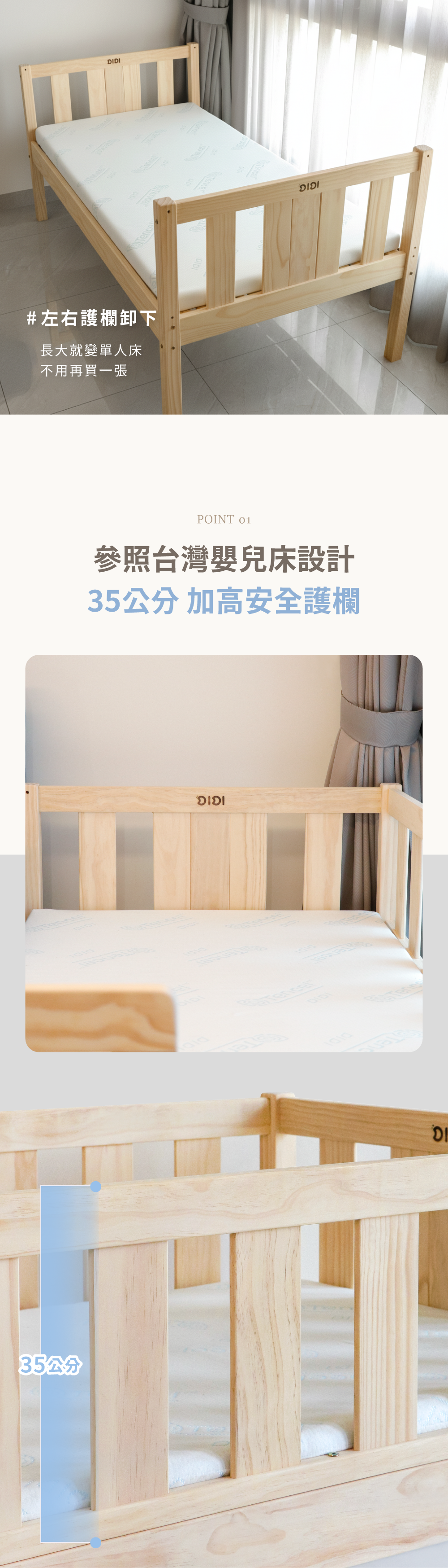 A1:採用台灣嬰兒床規範,護欄高度35公分,減去MIT 天絲透氣床墊厚度5公分,實際高於30公分,符合法規21公分以上。