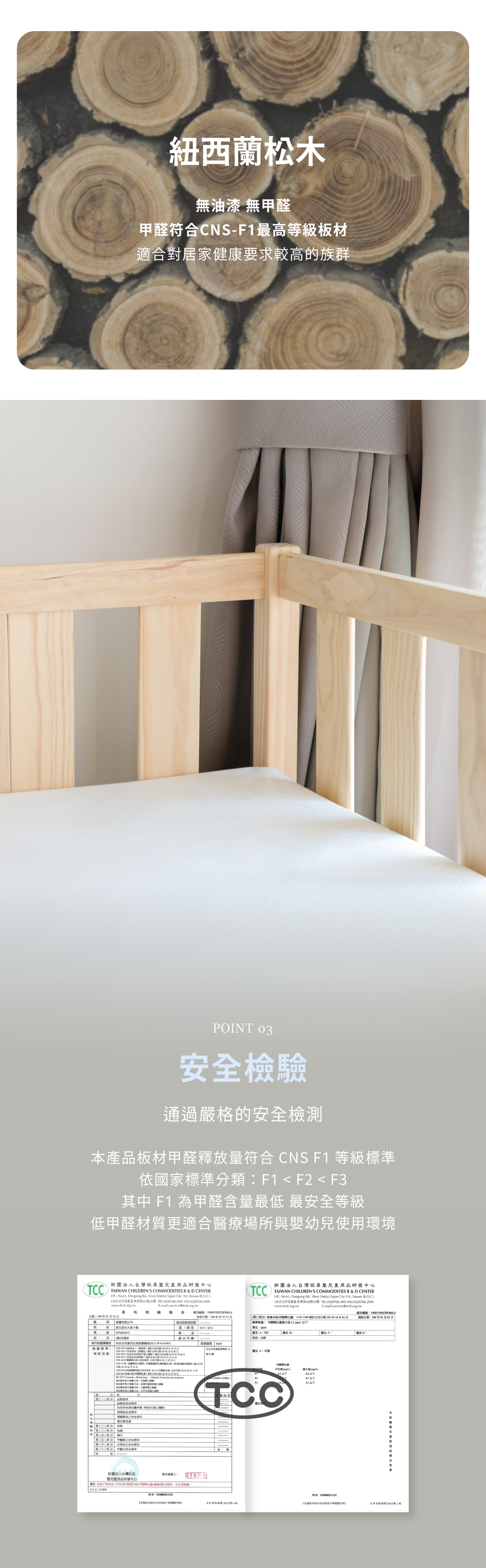 護欄高度 35cm 扣除床墊後實際高於 30cm,符合法規。欄距 8cm 依據日本嬰兒床規範設計。如需全封閉可加購床圍組。