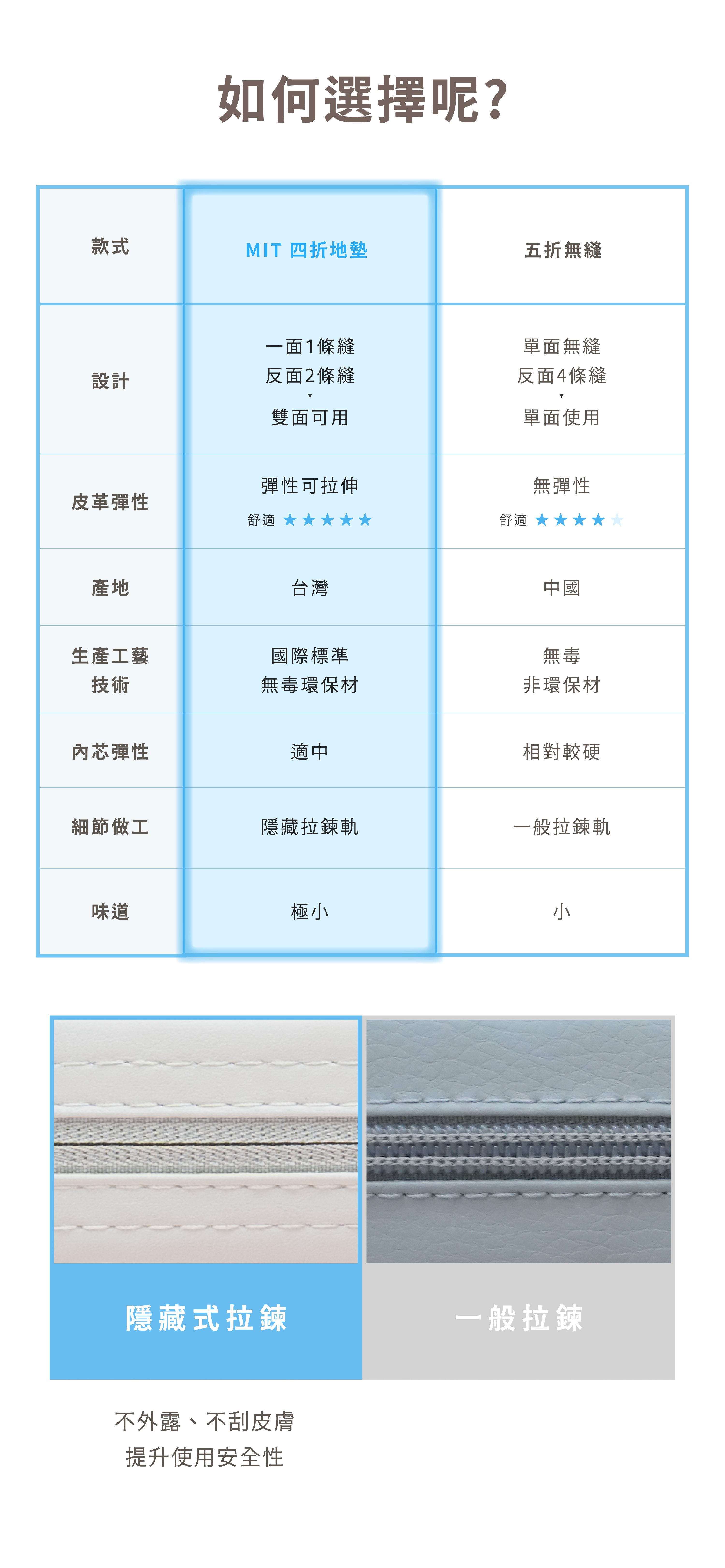 兩款材質手感與舒適度差異不大,主要差別在於折疊結構與製造地,可依空間配置自由選擇。