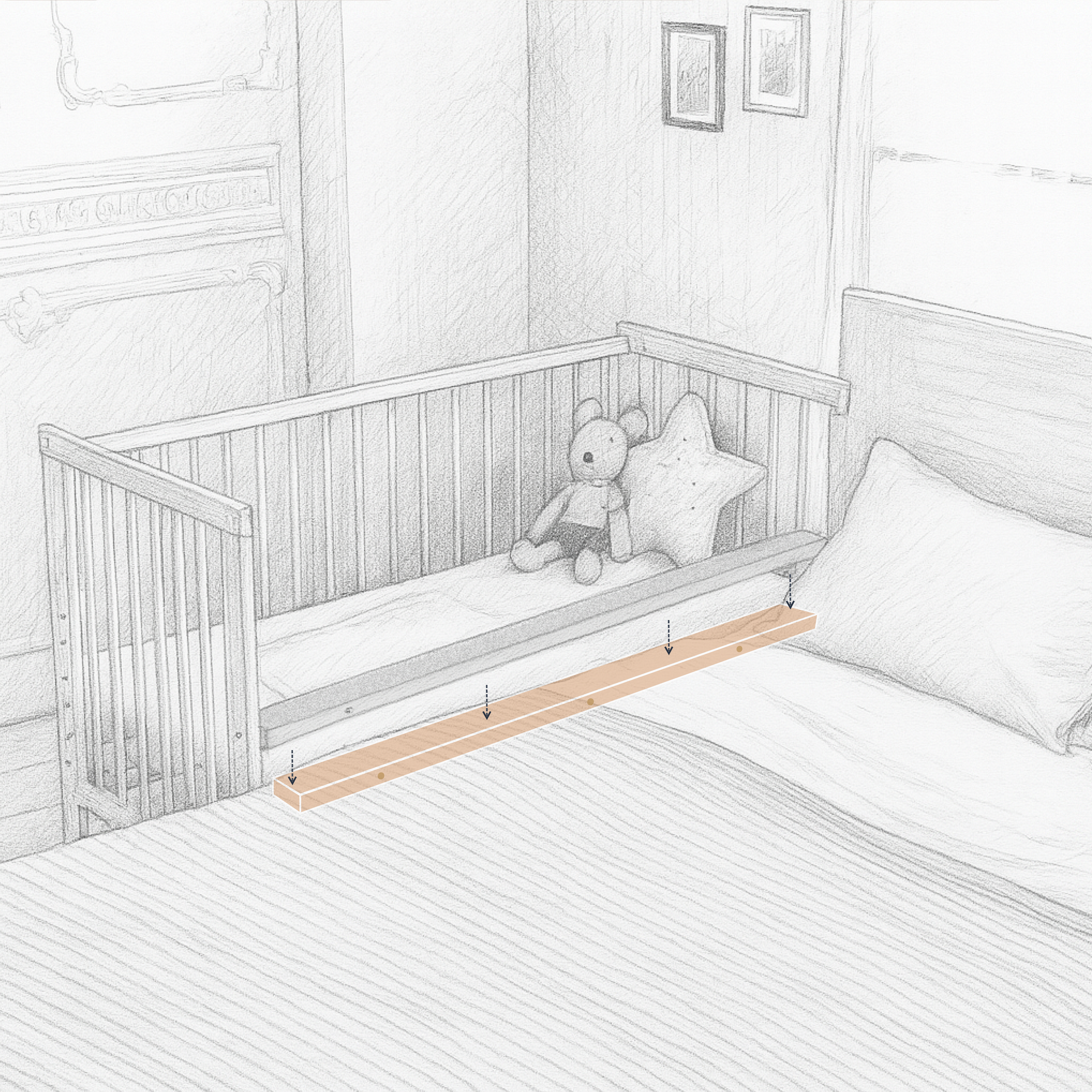 嬰兒床的床墊位置調整到矮於大人床13公分以上,利用高低差,可以預防孩子滾到大人床上。