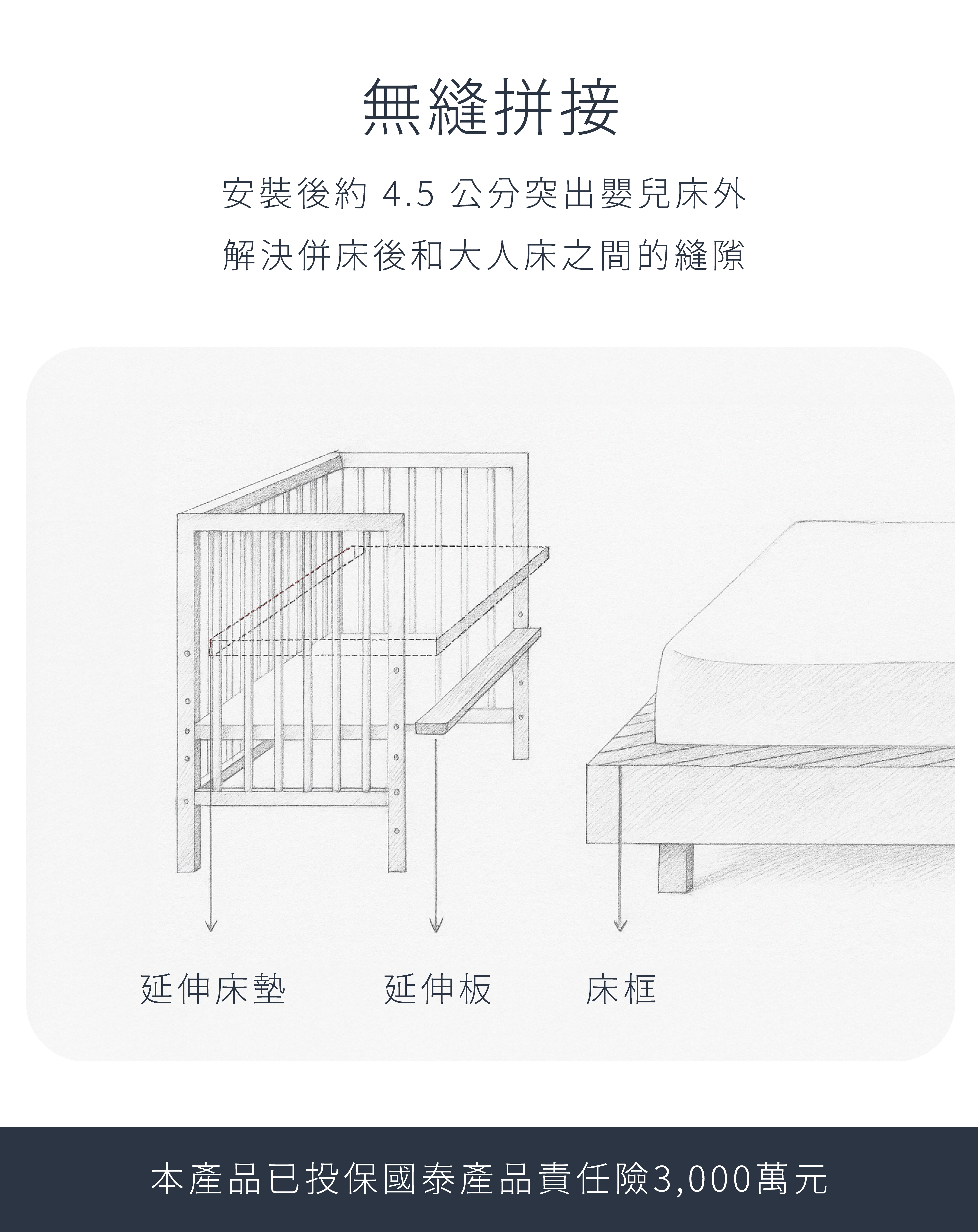 如果大人床有床框包覆床墊,務必使用,併床後嬰兒床和大人床之間的空隙,應小於5公分。