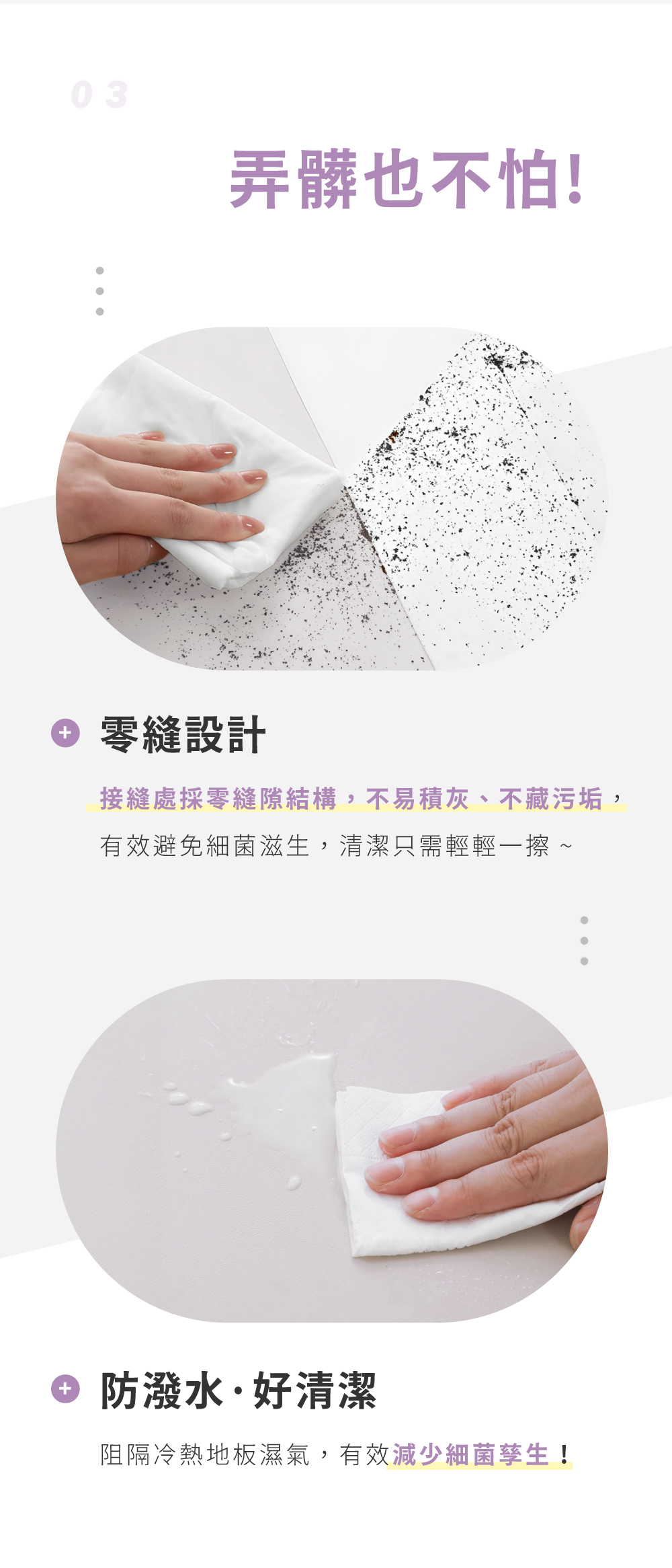 傳統地墊等同於直接裸用內芯,沒有外層保護,容易被寶寶摳破形成小洞,不僅影響美觀,還可能有誤食風險;稍微重一點的物品壓上去也容易留下無法恢復的壓痕,加上表面多為凹凸紋路,清潔困難。