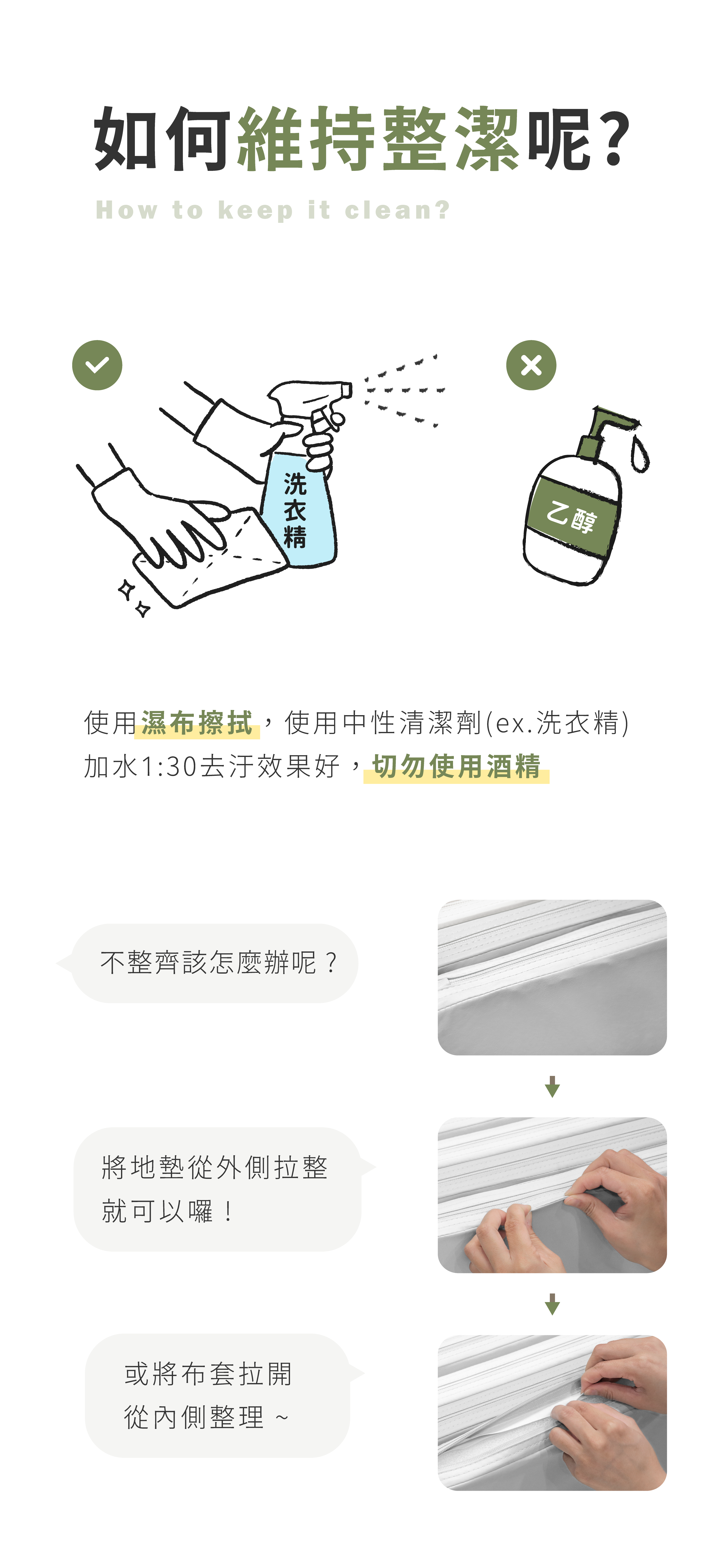 使用濕布擦拭清潔,亦可搭配中性清潔劑(如洗衣精)以 1:30 稀釋使用,去汙效果佳。請勿使用酒精或非中性清潔劑,避免損傷表面皮革。