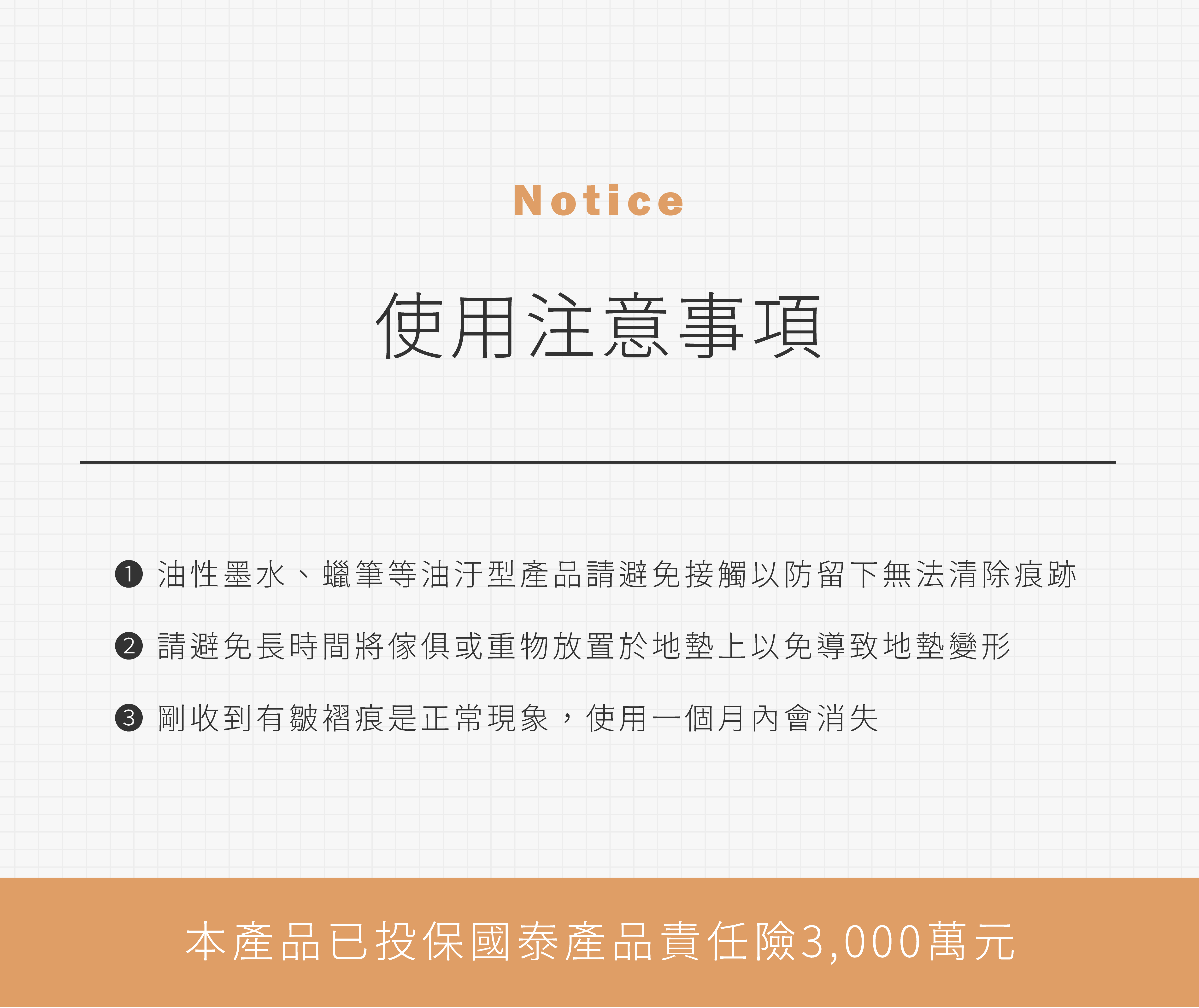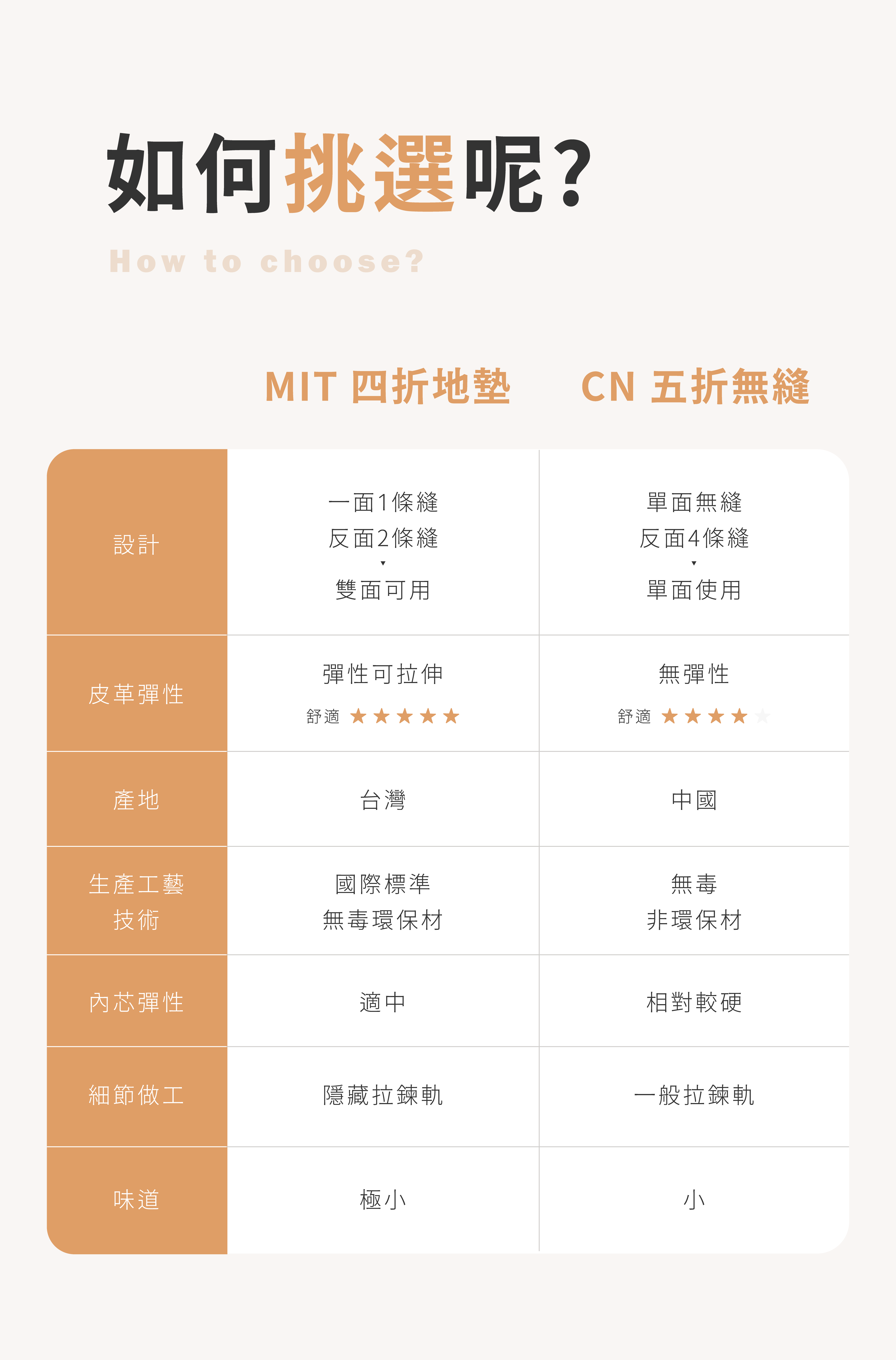 皮革地墊多了一層皮革包覆,能有效保護內芯;同時表面平整光滑,好清潔、不易受損,更安全耐用。