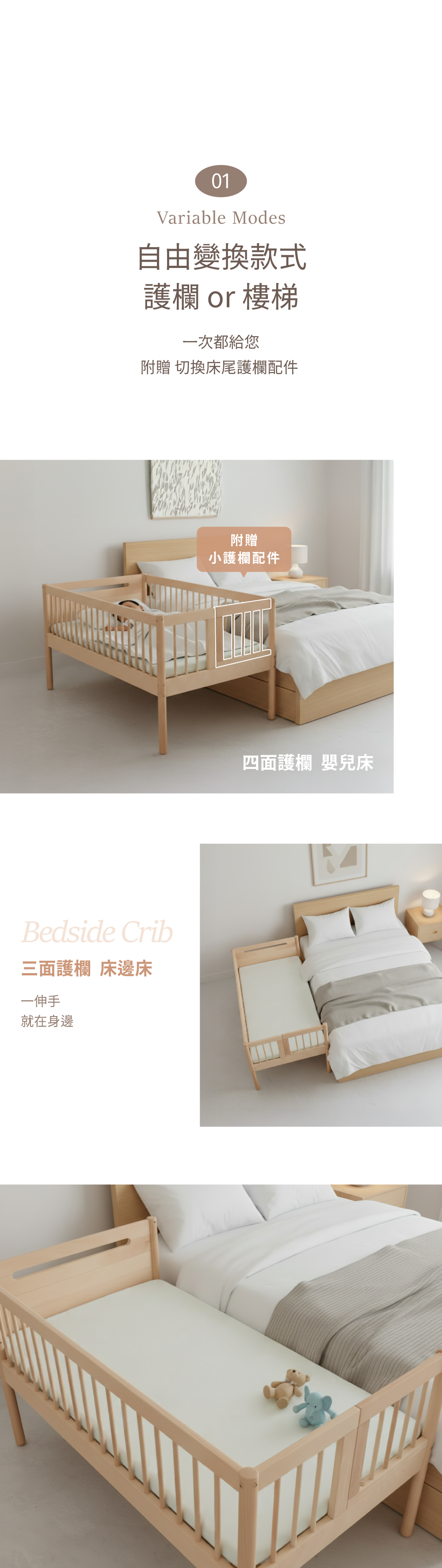 嬰兒(0~1 歲)使用,建議選擇落地款式(四面圍欄),待孩子長大後,可再評估加購正常高度床腿,即可轉換為床邊床或單人床。