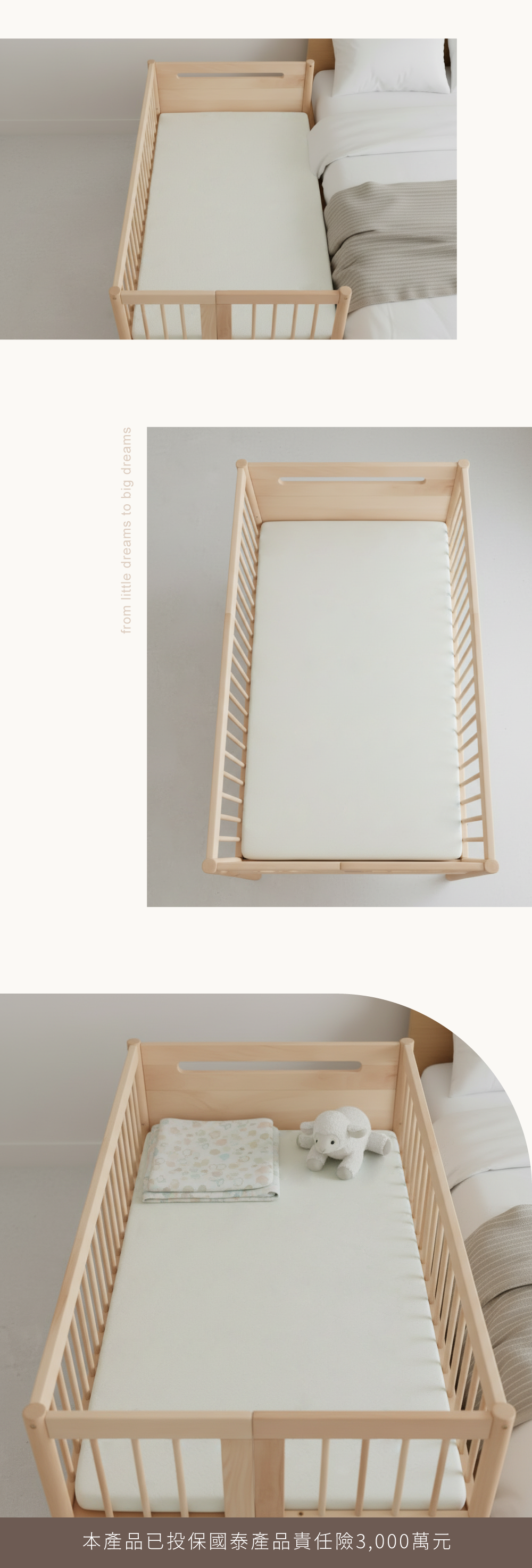 採用台灣嬰兒床規範。扣除床墊厚度 5cm 後,實際護欄高度仍高於 30cm,優於法規規定的 21cm 以上。