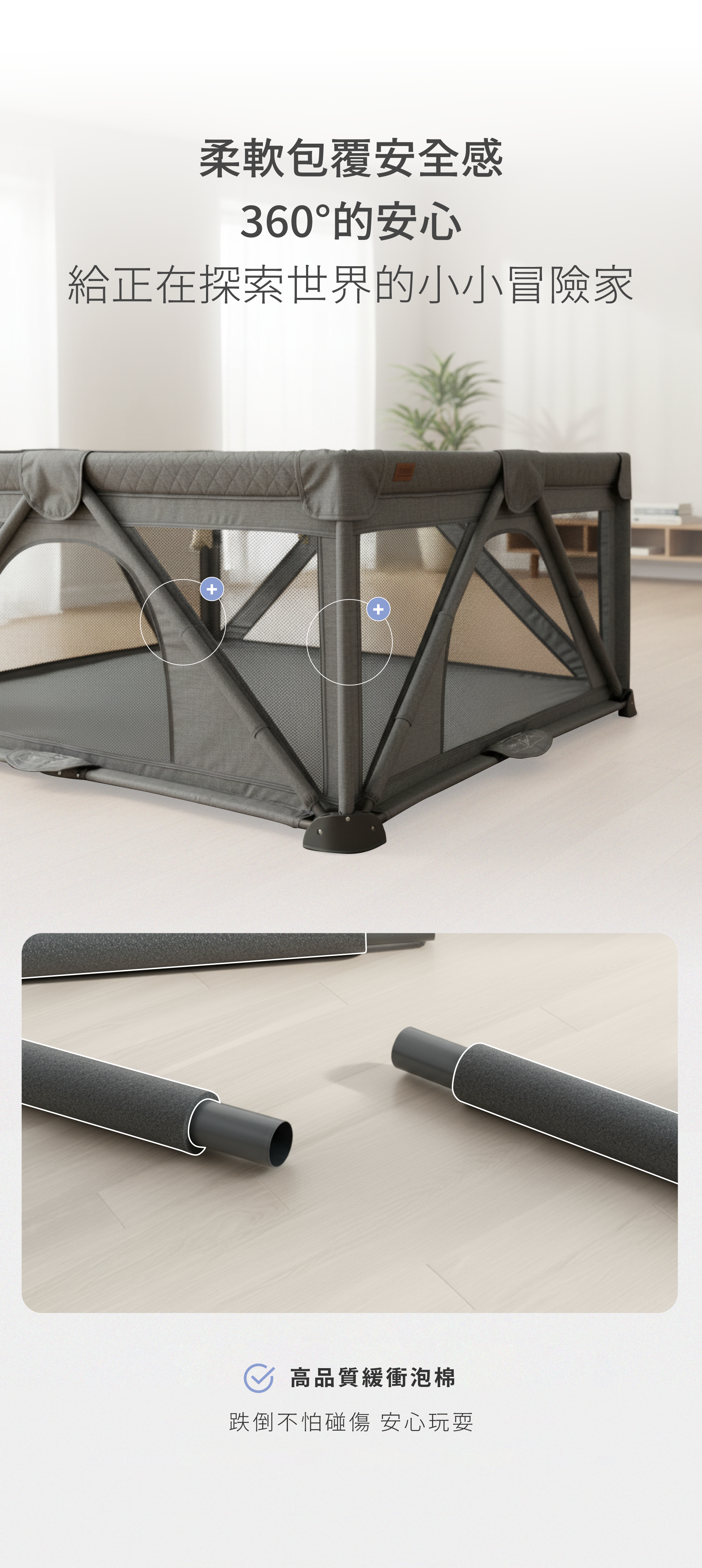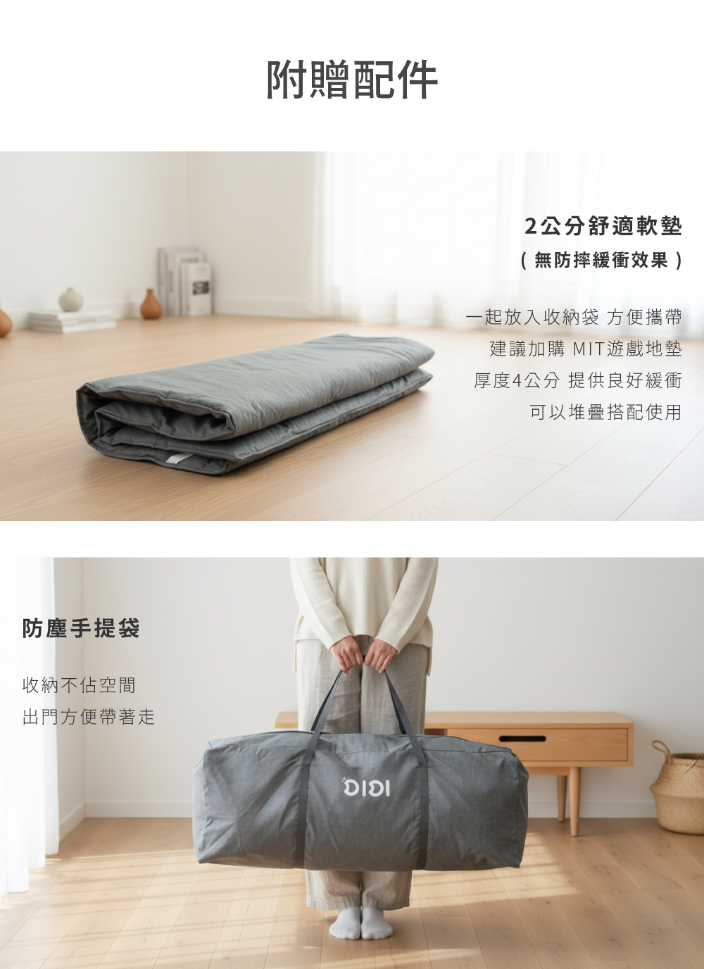 建議:長時間或定點使用時,建議搭配 DIDI MIT 遊戲地墊, 可上下堆疊 1 + 1 使用,提供更佳緩衝保護。