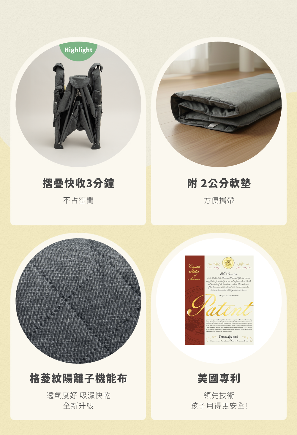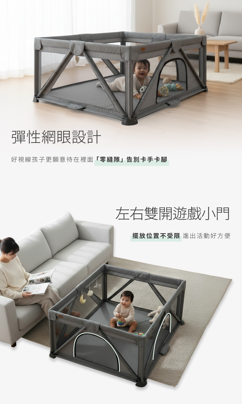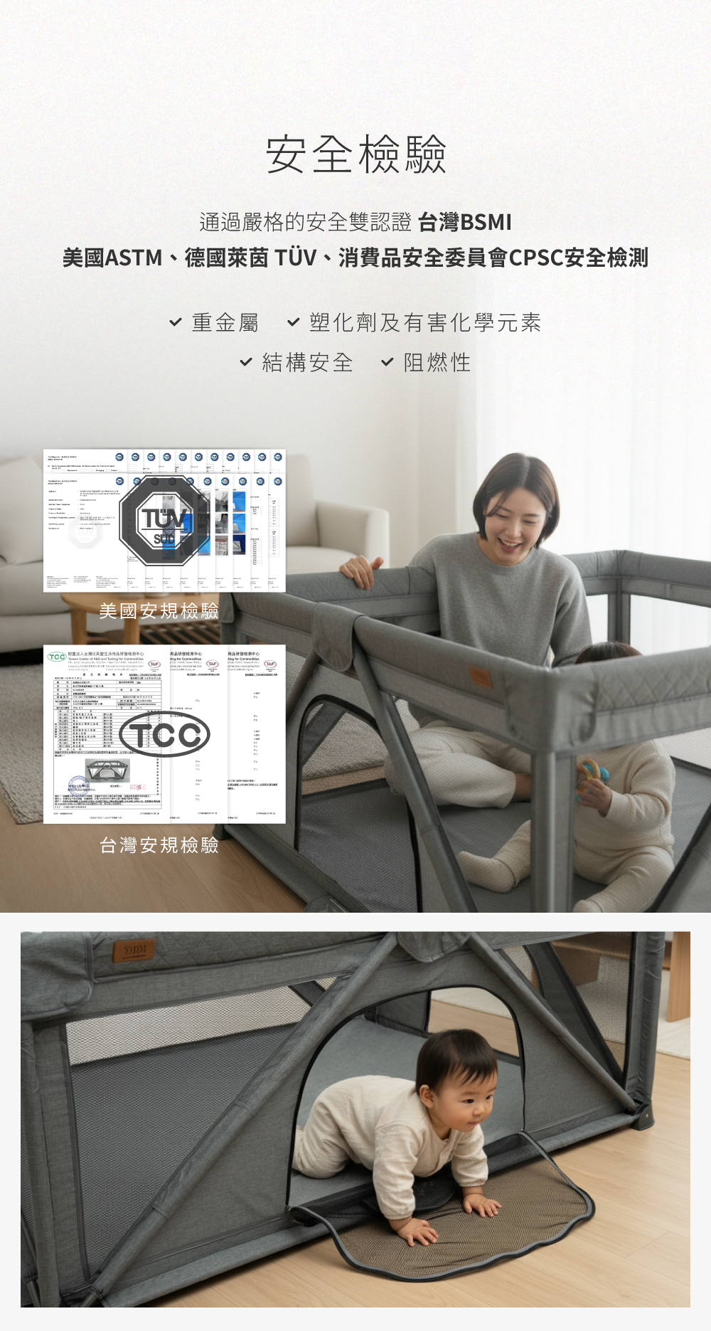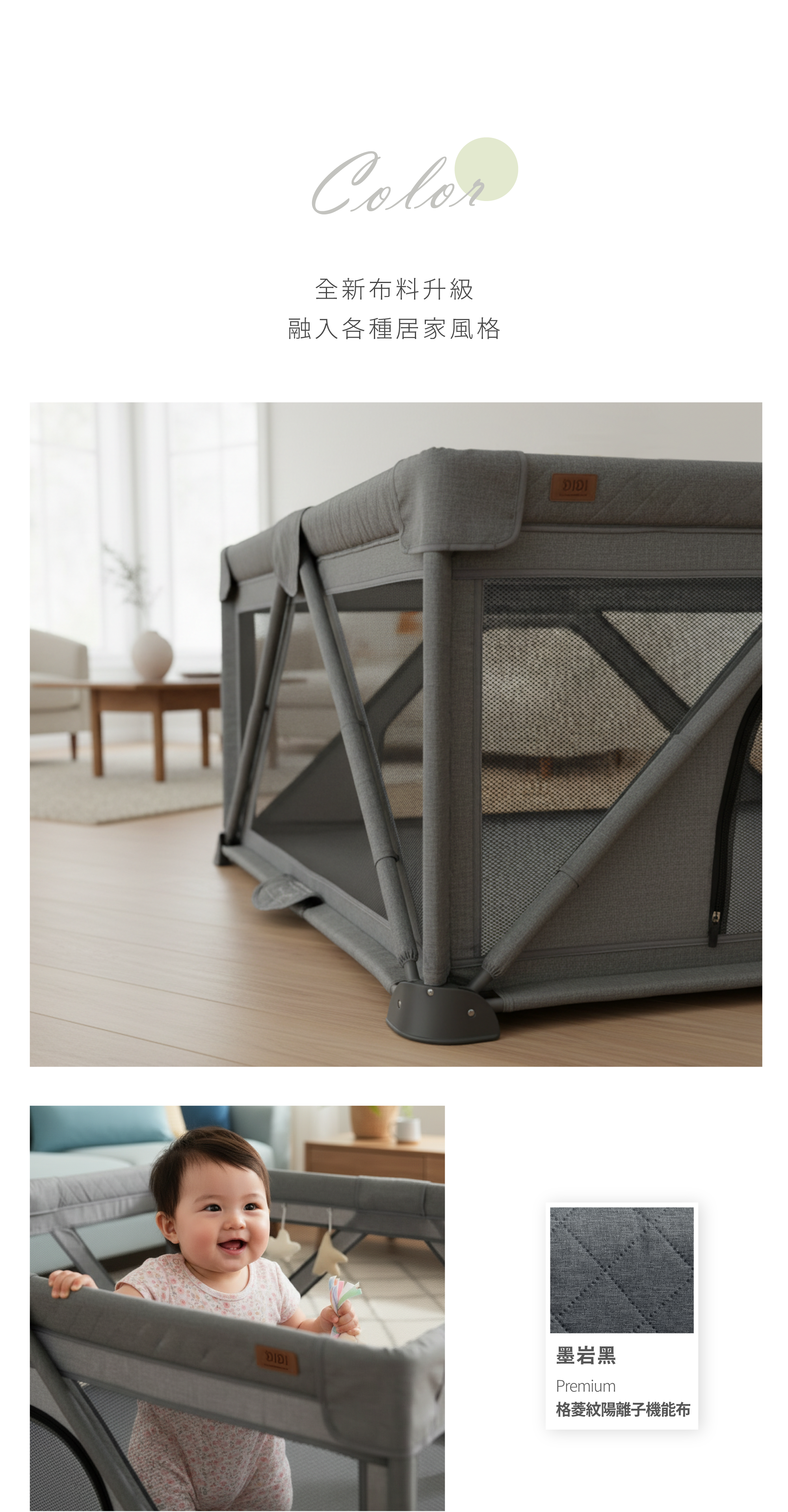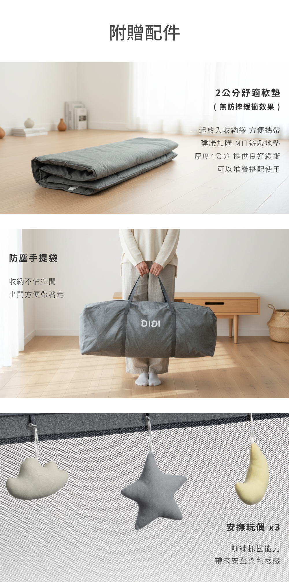 附贈的軟墊厚度為 2 公分,主要提供舒適性,不具備防摔緩衝效果。長時間或定點使用時,建議搭配 DIDI MIT 遊戲地墊堆疊使用,提供更佳緩衝保護。