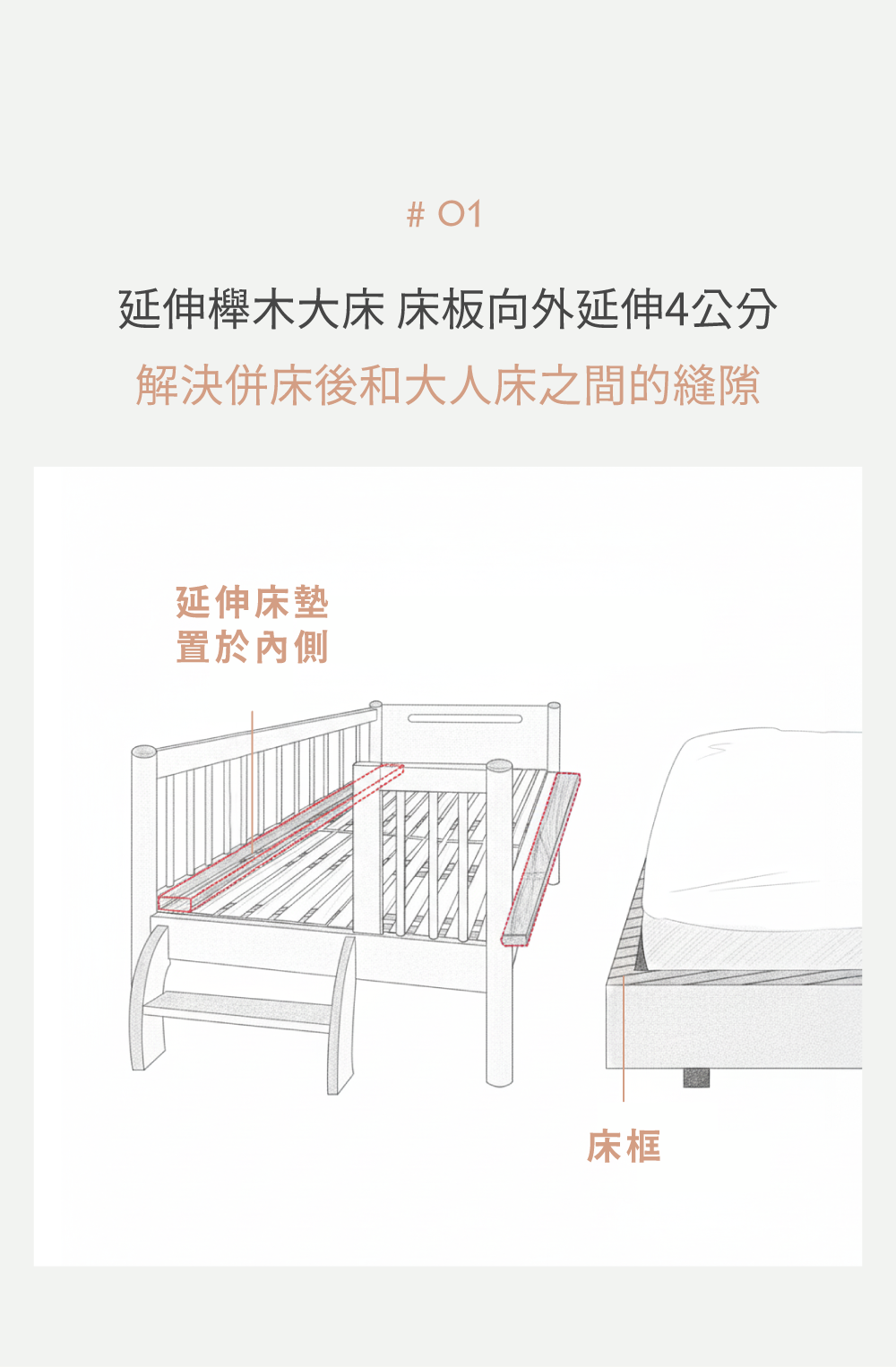 部分大人床會有凸起床框包覆床墊,併床後嬰兒床與大人床之間可能產生空隙, 若空隙過大,可能導致孩子手腳夾傷。