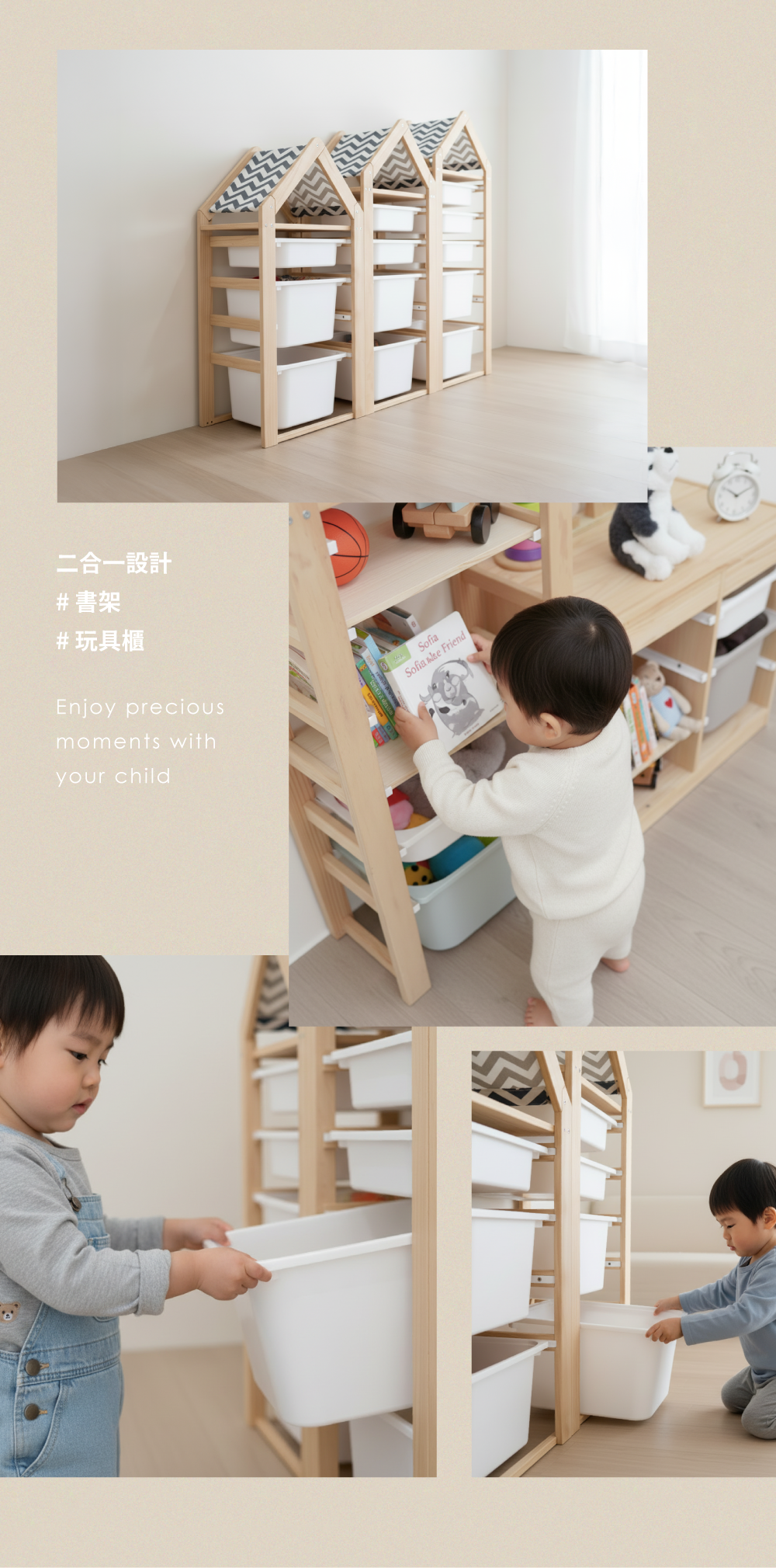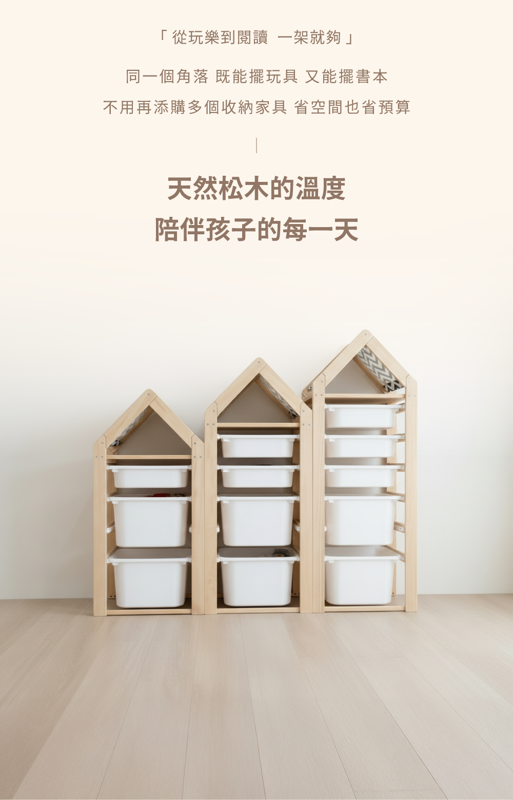 本產品不包含收納盒,須另行加購,顏色與大小可自由搭配。加購置物層板後可變為書架使用。