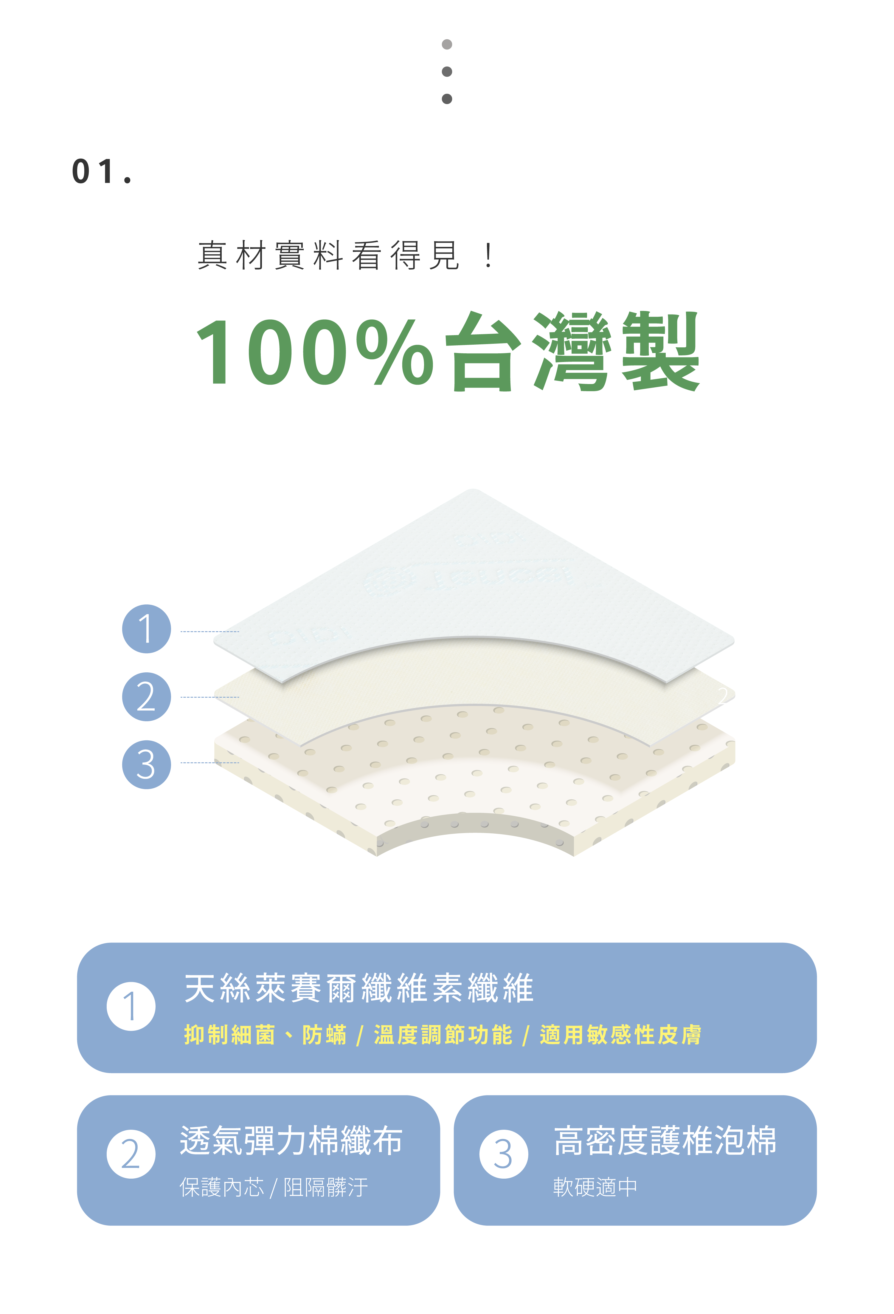 主要材質:100%純棉 (100% Cotton)、高密度護椎泡棉 (聚氨酯Polyurethane)