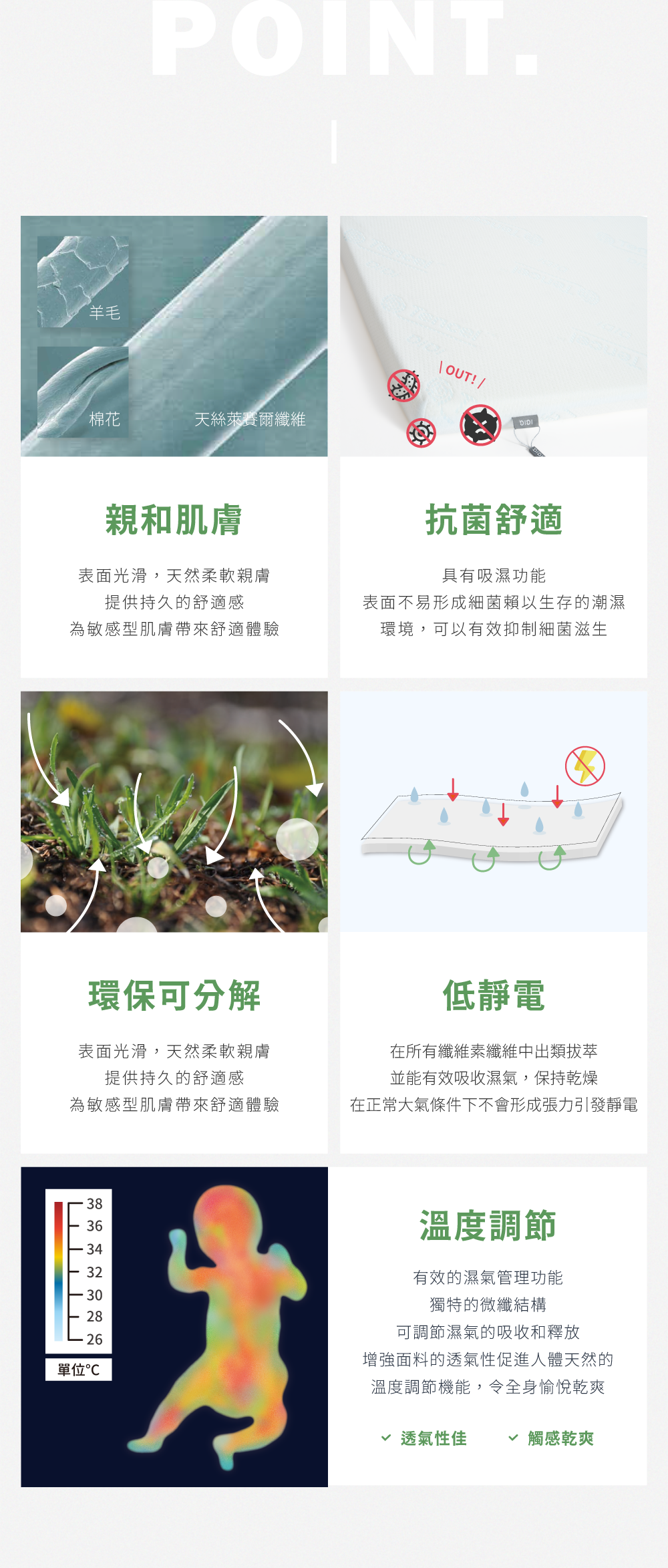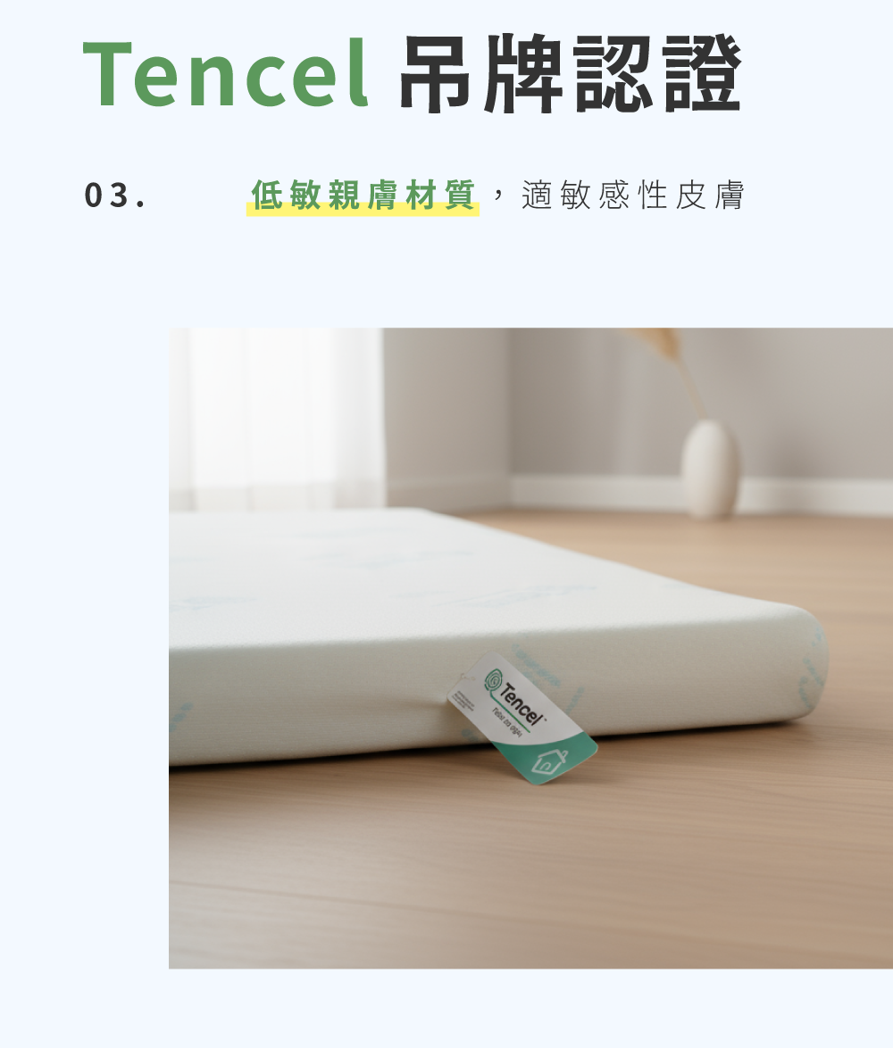 絕佳透氣舒適,每張床墊超過100個眼位透氣孔和具涼感溫調的天絲床套。
