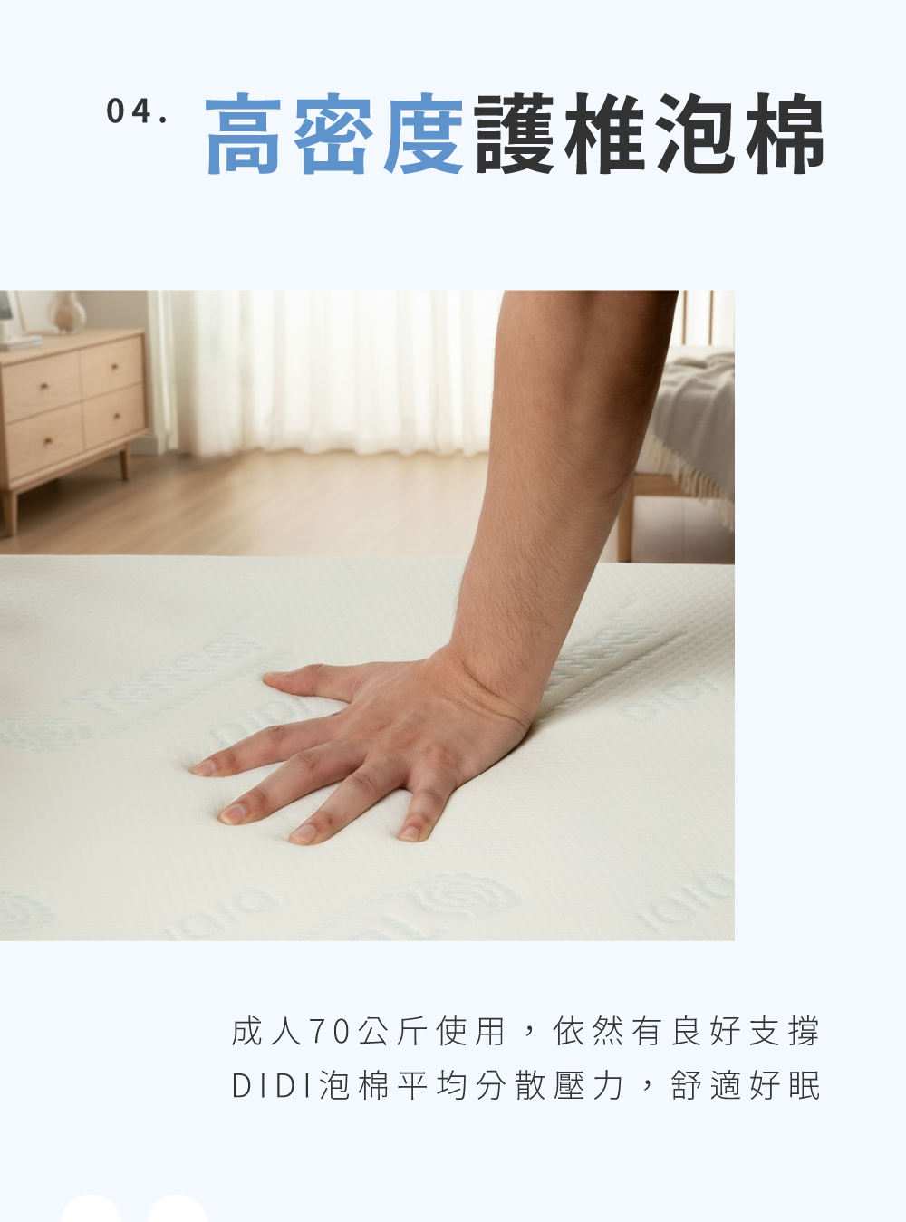 高密度護椎泡棉 - 局部手洗,不可機洗,自然晾乾,不可烘或曬,可以使用 60 ~ 65°C 高溫水殺菌除塵蟎。