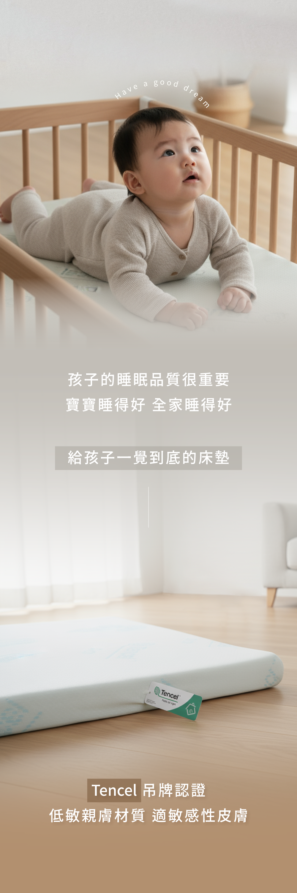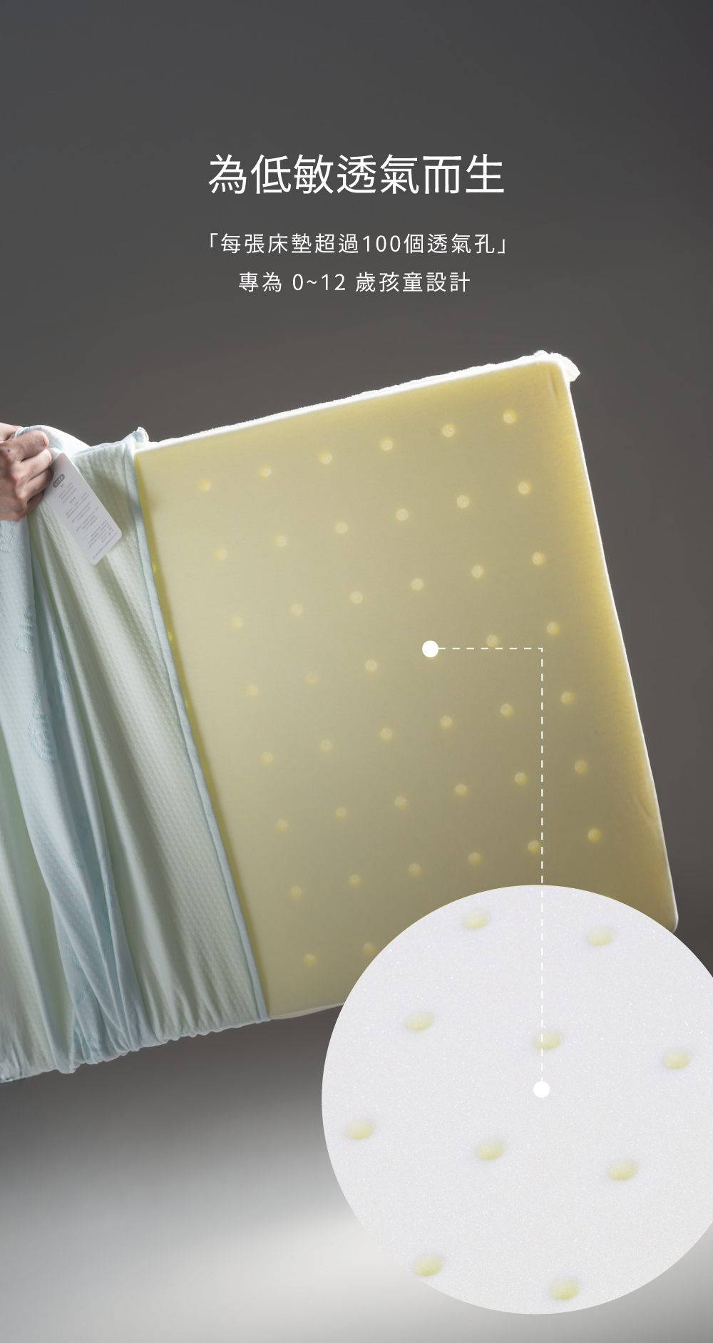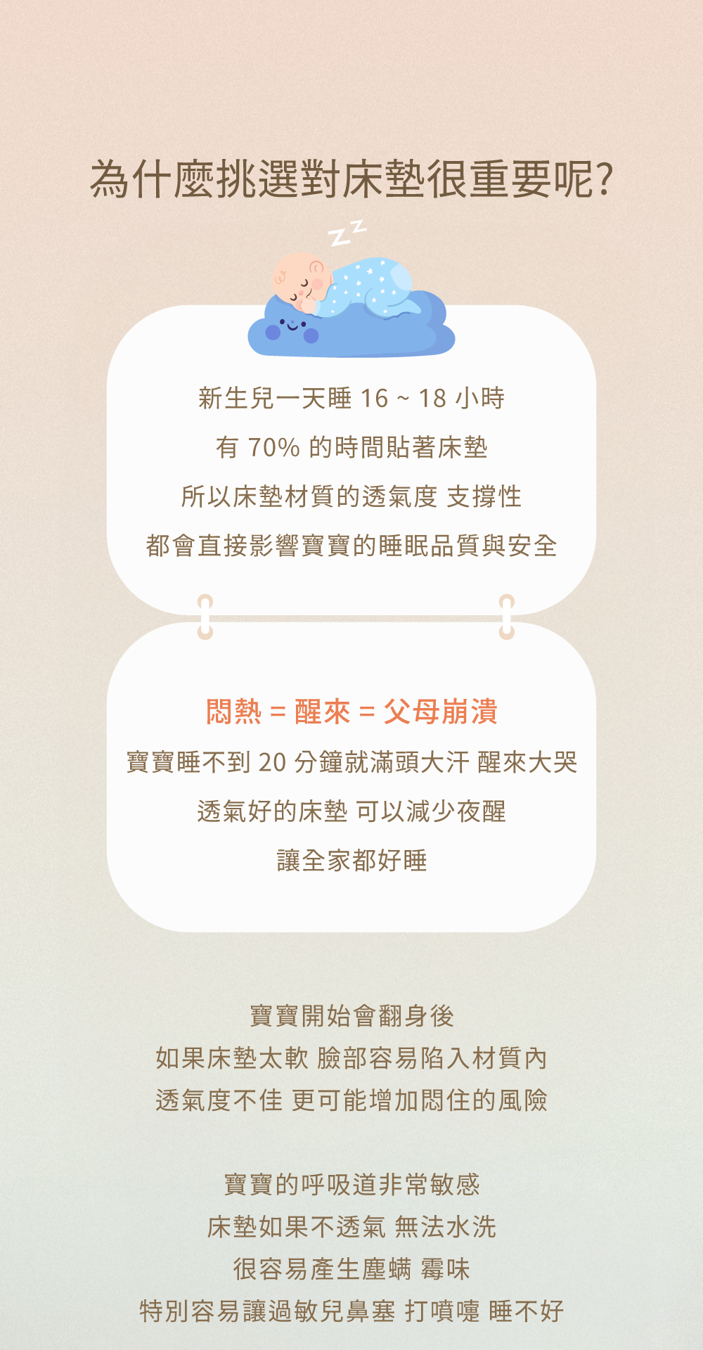 嬰幼兒床墊最重要的是 透氣性, 床套建議選擇親膚材質(原棉、天絲), 有助於降低肌膚摩擦造成的紅癢不適。