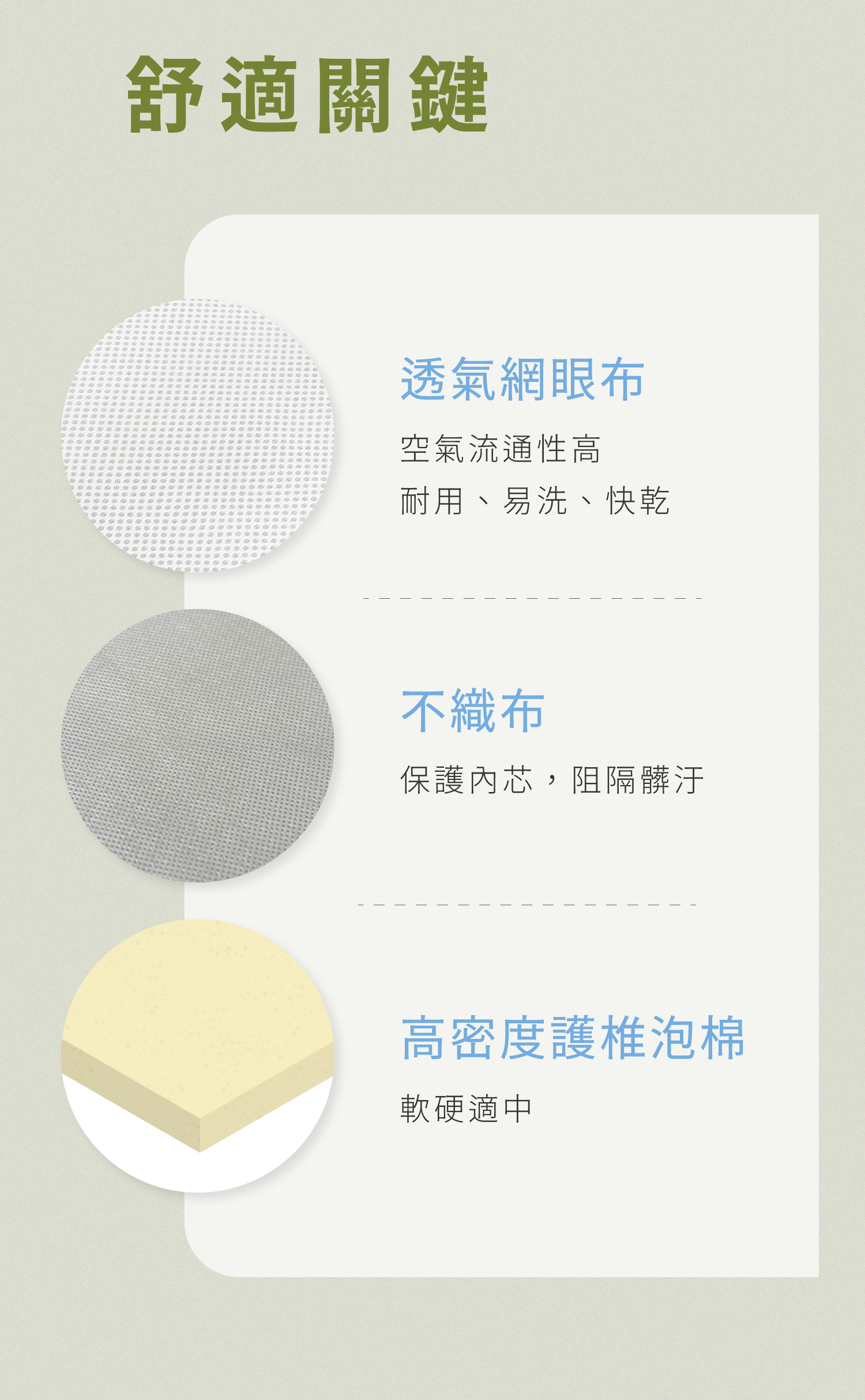 主要材質:透氣網眼布 (100%Polyester)、高密度護椎泡棉 (聚氨酯Polyurethane)